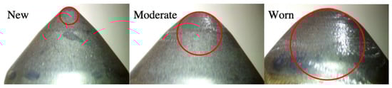Comparison of a new, moderately worn, and worn pick tip with 0.7× magnification. A circle is superimposed to show the increase in pick tip radius with increase in wear.