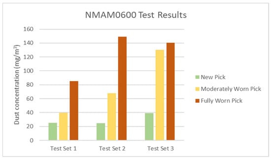 The NMAM 0600 results obtained from the multiple experiments are presented in Figure 6 as concentration. Concentration values reflect the unit of measurement used in industry for worker exposure values, such as time-weighted averages, ceiling values, or threshold limits. The data reveal that the concentration of the suspended respirable dust from the new to worn pick in mg/m3 increases with increase in pick wear for all three test sets. For example, the respirable dust particle concentrations in test set two increased from 25 mg/m3 to 68 mg/m3 to 149 mg/m3 as the wear of pick tip progressed from new to worn. Noting that the uncertainty, or precision, of the NMAM 0600 varies less than 10 µm for each sample with a 0.001 mg sensitivity balance, the trend between pick wears remains.