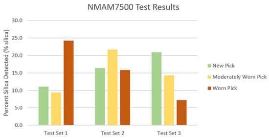 Percent silica detected per total sample of the suspended respirable limestone dust generated from each pick wear for the three test sets.
