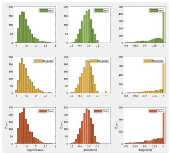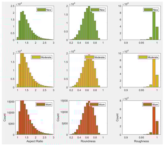 The aspect ratio, roundness, and roughness values calculated and represented in histograms for the deposited particles generated from the three different pick wears.