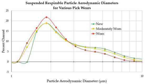 The particle size distribution of the suspended respirable particles generated from the new, moderately worn, and fully worn pick determined from laser diffraction of particles collected onto PC filters with cyclones.