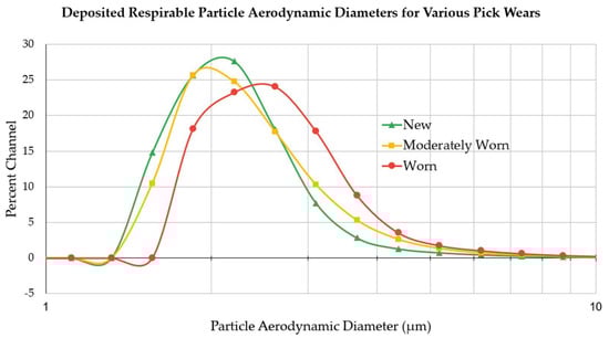 It is uncertain why the new pick generated larger suspended respirable particles, the worn pick generated smaller particles, and the worn pick generated particle sizes between the two. However, the slightly smaller deposited particle sizes generated from the new pick could possibly be attributed to the smaller surface contact area and point force that occurs during rock cutting with newer picks [,,,]. The single, smaller point of contact could lead to further crushing of the rock in this zone due to higher force concentration or higher stresses in the pressure bubble under the pick tip. In the end, there is a shift between the particle sizes on the suspended respirable and deposited particle graphs, but the shifts are not significant amounts, as most particle sizes generated from all the picks are still in the respirable region between 1.2µm and 4µm in aerodynamic diameter.