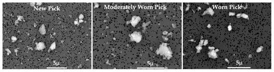 Raw FE-SEM example images of the particles generated from the new, moderately worn, and fully worn pick that shows the particles being similar shapes and sizes.