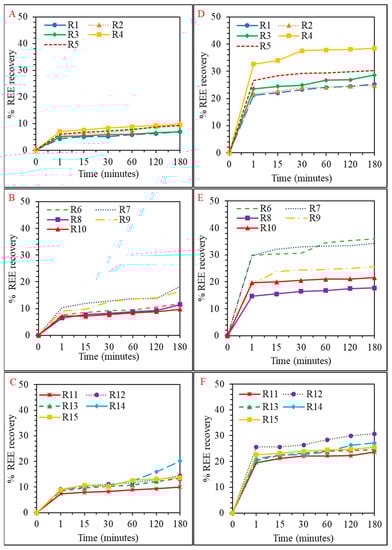 From Figure 1A–C, R14 (REE recovery 21%), R7 (REE recovery 18.4%), and R9 (REE recovery 16.4%) reflect a promising REE recovery potential for RC1 coal. It was observed that the REE recovery occurred instantaneously at one minute, thereafter, gradually increasing to a minimum until the end of the test. The high recovery noted for these three runs may be attributed to the high HCl concentration (≥1.25 M) and high leaching temperature (>40 °C) to which the RC1 coal was subjected. For the DC1 sample (Figure 1D–F), leaching runs R4, R6, and R7 presented an overall percentage REE recovery of 38.4%, 35.9%, and 34.3%, respectively. These tests were carried out using a low solid: liquid ratio (≤25 g/L), a high leaching temperature (>40 °C), and HCl concentration ≥ 1.25 M. The maximum REE recovery from DC1 coal (38.4%) was higher than from RC1 (21%). This recovery is similar to the result obtained by Yang et al. [40], where 50% of REEs were recovered from coal middling.