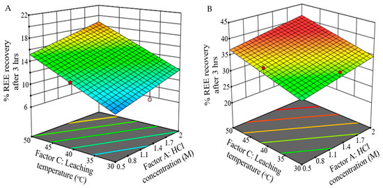 The interactions between HCl concentration (factor A), solid:liquid ratio (factor B), and leaching temperature (factor C) were studied to understand the simultaneous relationships between them. This study demonstrated the influence of these factors on the percentage of REE leaching recovery by engaging RSM on DOE to obtain 3D response surfaces. The optimal and best conditions are indicated in the dark red converging area, representing the highest % REE leaching recovery [46]. The RSM 3D plots for RC1 and DC1 (Figure 2A,B) were designed based on the actual model equations 5 and 6 for the % REE leaching recovery. The % REE leaching recovery improved with increased temperature and HCl concentration (Figure 2A,B). Several studies have also shown that REE recovery increases with increased temperatures and acid concentrations [11,50]. For both coal samples, an increase in HCl concentration increased the % REE leaching recovery. According to [11,52], an increase in acid load would result in an increase in hydronium ions in solution, which would result in a decrease in pH to near zero. At low pH values, REEs form cations that are easily dissolved in the lixiviate solutions by attaching to chlorine anions.