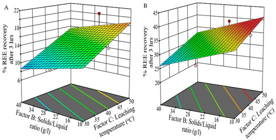 The 3D surface plots from the simultaneous effects of leaching temperatures between 30 °C to 50 °C and solid:liquid ratios ranging from 10 g/L to 40 g/L on the % REE leaching recovery are depicted in Figure 3A,B, respectively. The HCl concentration for these tests was kept at 2 M, and it is evident that the % REE leaching recovery increased as the leaching temperature increased to 50 °C. At a leaching temperature of 50 °C and pulp density of 10 g/L, the % REE leaching recovery reached a maximum of 18.8% and 40% for RC1 and DC1, respectively (Figure 3). Several studies on REE leaching recovery from coal and different REE-based ores have indicated that REE recovery increased with an increase in leaching temperature and a decrease in solid:liquid ratio [11,47,50,53,54].