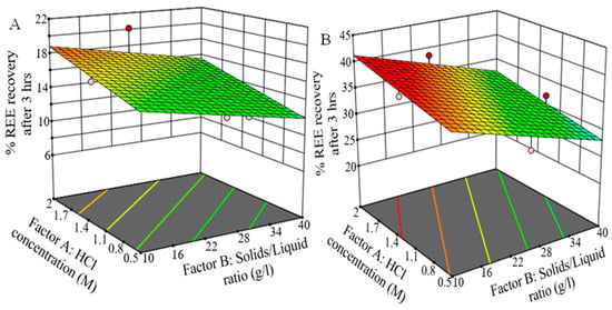 Figure 4A,B depicts the relationship between the solid:liquid ratio at 10 g/L to 40 g/L and HCl concentration ranging between 0.5 M to 2 M at a constant temperature of 50 °C. From the 3D surface plots (Figure 4), it was observed that an increase in REE recovery was due to an increase in acid concentration and a decrease in pulp density. This observation was similar to that reported by Chi et al. [53], Cao et al. [54], Amine et al. [47], and Yang (2019) [11] on the influence of acid concentration and pulp density on REE recovery.