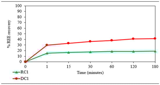 The optimal leaching conditions were verified by subjecting RC1 and DC1 to leaching under the optimal parameters (HCl concentration of 2 M, solid:liquid ratio of 10 g/L, and leaching temperature of 50 °C). RC1 exhibited an REE leaching recovery of 18.95%, and DC1 achieved a leaching recovery of 41.35%, as depicted in Figure 5. The recovery of the REEs in both samples can be seen to occur instantaneously within the first minute and then gradually increases over three hours, with only an increase of 5% (DC1) to 10% (RC1). Studies on REE leaching from coal and other minerals are well aligned with the REE recovery reported in this study [37,40,42,52]. In some studies, the recovery of REEs was higher, as most of these studies were conducted at a particle size below 10 µm [11]. However, it was observed that, within a one- to ten-minute period, REEs were leached into the lixiviate instantaneously (Figure 5). The optimal leaching conditions predicted by the model (Equations (3) and (4)) were validated, as the model predicted % REE leaching recovery close to the optimal experimental REE leaching recovery.