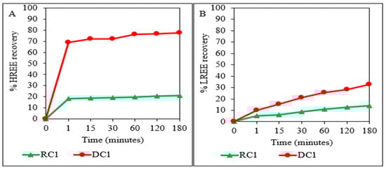 Under the same optimal leaching conditions, the results obtained for the % HREE and % LREE recovery for the DC1 and RC1 coals are depicted in Figure 6A,B, respectively. 77% of HREE were recovered from DC1, while RC1 manifested a % HREE recovery of 21.03% (Figure 6A). The % LREE recovery for RC1 and DC1 was 14% and 32%, respectively (Figure 6). The higher HREE recovery indicates that the HREEs dissolve more rapidly under optimal leachate conditions within the first minute. However, the LREEs display a slow dissolution in solution in the first 15 minutes, but over time, the LREEs typically increase in solution. The results of the higher extraction efficiency of HREEs suggest that they form weak ion-adsorbed bonding complexes with organic or inorganic minerals within coal [56]. In addition, more HREEs were released into the leachate from the DC1 coal, which contains a higher ash content relative to the RC1 coal, as reported by Harrar et al. [27]. This may be because the carbon fraction of RC1 (high carbon) uses more acid, leaving less HCl acid to react with the REEs in the coal. The low recovery noted in the LREEs could be because they are strongly attached to the insoluble high minerals, such as silicates, kaolinite, pyrite, magnetite, and zircon, present in the coal utilised [27]. These minerals require more contact time, more aggressive leaching concentrations, and higher temperatures to solubilise the REE-bearing minerals within [41]. In retrospect, HREEs were dispersed and weakly adsorbed to organic matrices or weakly adsorbed to clayey mineral sites, whereas the LREEs formed more stable, strongly nested bonds with the mineral fraction, as illustrated by their slower REE recovery over time. The high HREE recovery of 77% from DC1 implies that discarding coal is a promising potential source of economic gain, as no prior mining is required.