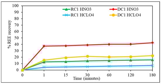 Leaching experiments were conducted at the optimal leaching parameters of 2 M acid, 50 °C, and a solid:liquid ratio of 10 g/L with nitric acid and perchloric acid. The percentage of REEs recovered from both acids was compared to that of the HCl leaching process. Both RC1 and DC1 were subjected to HNO3 and HClO4 leaching at 2 M. After three hours of leaching, 15.9% of the REEs were recovered using the nitric acid lixiviate, while the perchloric acid only achieved a 7.08% REE recovery from RC1 (Figure 7). The HNO3 and HClO4 leaching applied to DC1 exhibited REE recovery of 42.57% and 22.39%, respectively (Figure 7). Thus, nitric acid was more effective than perchloric acid in leaching REE.
