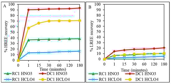 RC1 and DC1 % HREEs (A) and % LREEs (B) leaching recovery under the optimised leaching parameters (HClO4/HNO3 concentration of 2 M, solid:liquid ratio of 10 g/L, leaching temperature of 50 °C, D90 = −106 µm, stirrer speed 550 rpm).
