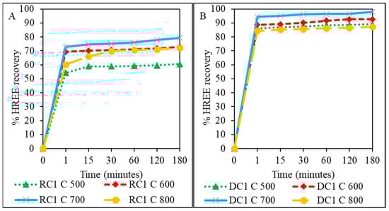 Calcined RC1 (A) and DC1 (B) % HREE leaching recovery under the optimised leaching parameters of (HCl concentration of 2 M, solid:liquid ratio of 10 g/L, leaching temperature of 50 °C, D90 = −106 µm, stirrer speed 550 rpm).