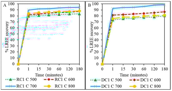Calcined RC1 (A) and DC1 (B) % LREE leaching recovery under the optimised leaching parameters of (HCl concentration of 2 M, solid:liquid ratio of 10 g/L, leaching temperature of 50 °C, D90 = −106 µm, stirrer speed 550 rpm).