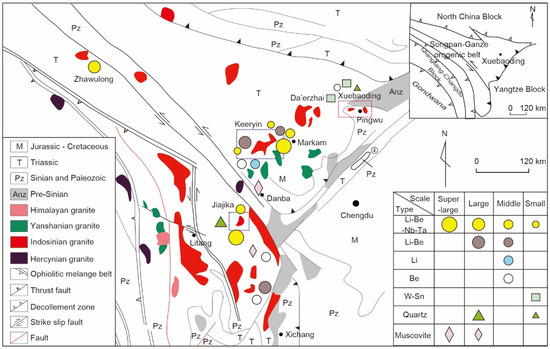The Songpan–Garze orogenic belt (SGOB) is an area well-known for its Li, Be, Nb, and Ta concentrations in China. Large and super-large granitic pegmatite-type rare metal deposits, represented by the Jiajika and Ke’eryin deposits, mainly occur along the eastern margin of the SGOB. In recent years, several high-temperature hydrothermal W–(Sn–Be) deposits have been identified in the Yidun island arc belt of the SGOB and the adjacent Qinling orogenic belt [1,2]. The Xuebaoding mining area in the northeastern part of the SGOB is known for producing large, colorful, euhedral, ornamental- to gem-grade crystals of scheelite, cassiterite, and tabular beryl [3,4,5,6,7,8,9,10,11]. Chronological data (216~182 Ma) of these rare metal deposits, including the Jiajika, Ke’eryin, and Xuebaoding deposits, show that a large-scale rare-metal metallogenic event occurred in the SGOB from the late Indosinian to the early Yanshanian; such large-scale rare-metal metallogenic events are closely related to the peraluminous granitic magma activities during this period [1,12,13,14,15,16,17,18,19].
