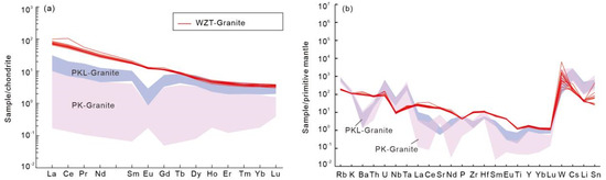 (a) Chondrite-normalized REE distribution patterns and (b)primitive mantle-normalized trace element spider diagrams of the Wuzhutang granite from the Xuebaoding mining area, Sichuan Province, China. Data for the chondrite and primitive mantle are computed from [58], and data of the Pankou and Pukouling granites are from [38,39].