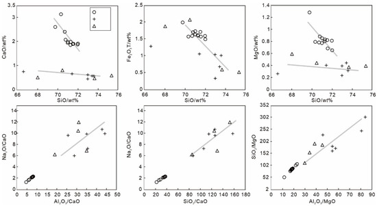 The Wuzhutang granite contained abundant muscovite and exhibited SiO2 concentrations in excess of 67%, an aluminum saturation index greater than 1, a C value (corundum content) greater than 1 (based on of CIPW calculations), 87Sr/86Sr(t) > 0.706, and εNd < −2%, indicating peraluminous properties [62,63,64], which were similar to the properties of the Pankou and Pukouling granites [39]. In the Harker diagram (Figure 8), the CaO, Fe2O3T, and MgO contents of the Wuzhutang granite displays an obvious negative linear correlation with SiO2 content, and the Na2O/CaO vs. Al2O3/CaO, Na2O/CaO vs. SiO2/CaO, and SiO2/MgO vs. Al2O3/MgO plots display an obvious positive linear correlation. Although samples of the Pankou and Pukouling granites display similar trends, their data points are relatively scattered, which indicates that the Wuzhutang granite originated from a relatively more homogeneous magma source [65].