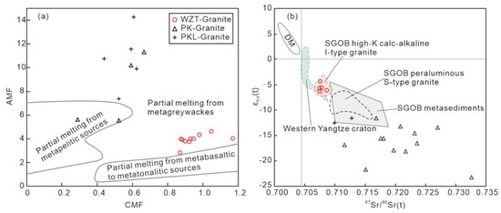 Binary diagrams showing the source of the Wuzhutang granite from the Xuebaoding mining area, Sichuan Province, China. (a) Plot of CMF vs. AMF (CMF-CaO/(MgO + FeOT); AMF-Al2O3/(MgO + FeOT) (after [72]) of the Wuzhutang granite. (b) Plot of 87Sr/86Sr(t) vs. Nd(t) of the Wuzhutang granite. Sr–Nd isotopic data of the SGOB high-K calc–alkaline I-type granite is from [73,74], that of the SGOB peraluminous S-type granite is from [47,74,75], that of the SGOB metasediments is from [47,74], that of the western Yangtze craton is from [74]; geochemical data of the Pankou and Pukouling granites are from [38,39].