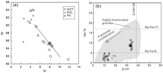 Binary diagrams showing the degree of differentiation of the Wuzhutang granite from the Xuebaoding mining area, Sichuan Province, China. (a) Plot of SI vs. DI of the Wuzhutang granite. (b) Plot of Zr/Hf vs. Nb/Ta of the Wuzhutang granite. Data of highly fractionated granites are from [44], data of the Pankou and Pukouling granites are from [38,39].