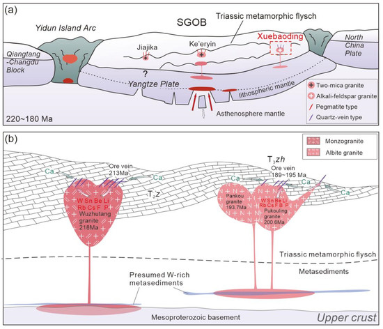 (a) Schematic model explaining the geodynamic setting of the rare metal mineralization in the Songpan–Garze orogenic belt (modified after [90]). (b) Schematic model illustrating the formation of granitoids and ore veins in the Xuebaoding mining area, Sichuan Province, China.