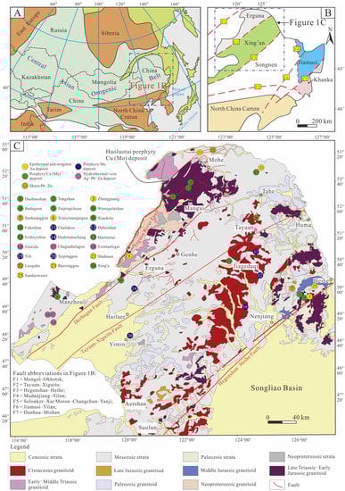 As one of the largest orogenic collages in the world, the Central Asian Orogenic Belt (CAOB) is located between the East Europe, Siberia, Tarim, and North China cratons (Figure 1A). The northern Great Xing’an Range (NGXR) is tectonically located in the eastern segment of the CAOB (Figure 1A,B) and hosts a number of epithermal and orogenic Au, hydrothermal Ag–Pb–Zn, porphyry, and skarn Pb–Zn deposits (Figure 1C). Over the past decade, many late Mesozoic porphyry deposits in the NGXR have been discovered and raised concern (Figure 1C). Examples include the Daheishan Mo (ca. 147 Ma; [1]), the Chalukou Mo (ca. 148 Ma; [2]), the Fukeshan Cu (Mo) (ca. 149 Ma; [3,4]), and the Xiaokele Cu (Mo) (ca. 150 Ma; [5]) deposits.
