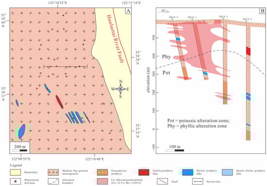 (A) Geological map of the Huoluotai Cu (Mo) deposit (modified from [8]). (B) Geological sections in the Huoluotai Cu (Mo) deposit (modified from [8]).