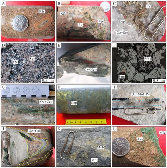 Photographs and photomicrographs of representative hydrothermal alterations and ore mineralization features in the Huoluotai Cu (Mo) deposit. (A) Potassic alteration observed in the granodiorite porphyry. (B) Potassic alteration overprinted by epidote alteration. (C) Phyllic alteration in the granodiorite porphyry. (D) Phyllic alteration characterized by an alteration assemblage of sericite and quartz. (E) Stage I quartz + hematite vein in potassic-altered granodiorite porphyry. (F) Anhedral hematite and magnetite in stage I. (G) Stage II quartz + chalcopyrite vein in potassic-altered granodiorite porphyry. (H) Dense disseminated chalcopyrite developed in the granodiorite porphyry. (I) Stage III quartz + molybdenite + pyrite vein in phyllic-altered wall rock. (J) Stage IV quartz + calcite vein in potassic-altered granodiorite porphyry. (K) Primary molybdenite oxidized to molybdite. (L) Primary chalcopyrite oxidized to azurite and malachite. Abbreviations: Qz = quartz; Kfs = K-feldspar; Ep = epidote; Ser = sericite; Cal = calcite; Mag = magnetite; Hem = hematite; Py = pyrite; Ccp = chalcopyrite; Mol = molybdenite; Myb = molybdite; Mlc = malachite; Azu = azurite.