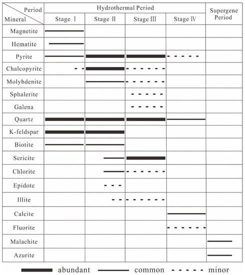 Based on the mineral assemblages and crosscutting relationships between veins in the Huoluotai Cu (Mo) deposit (Figure 3), four mineralization stages were identified: the sulfide-barren quartz stage (stage I), the quartz + chalcopyrite ± pyrite ± molybdenite stage (stage II), the quartz + polymetallic sulfide stage (stage III), and the quartz + calcite ± pyrite ± fluorite stage (stage IV) (Figure 4). Stage I is characterized by sulfide-barren quartz veins, which are rare and generally discontinuous (Figure 3E). There is no obvious cutting relationship between the veins in stage I and those in other mineralization stages. Stage I veins are mainly concentrated in the potassic alteration zone. Copper is mainly found in stage II. Stage II veins are generally continuous and irregular (Figure 3G) and mainly contain quartz, chalcopyrite, pyrite, and molybdenite. Stage II veins are distributed mainly in the potassic alteration zone. Stage III veins are generally continuous and straight (Figure 3I) and are characterized by quartz, pyrite, and molybdenite. Stage III veins are usually concentrated in the phyllic alteration zone. Stage IV veins are usually irregular and dominated by quartz and calcite (Figure 3J), with small amounts of fluorite. The sulfide observed in stage IV is only pyrite. Supergene mineralization is dominated by molybdite, azurite, and malachite (Figure 3K,L).