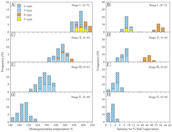 Stage III (quartz): L- and V-type FIs are widespread in stage III quartz (Figure 5G,H). The L-type FIs homogenized into the aqueous liquid phase at 223–336 °C (peaking at 280–320 °C, n = 47) (Figure 6E) and yielded final ice-melting temperatures (Tm-ice) of –4.5 to –0.9 °C, with calculated salinities of 1.6–7.2 wt.% NaCl equivalent (peaking at 4–6 wt.% NaCl equivalent, n = 47) (Figure 6F). The V-type FIs homogenized into the vapor phase at 265–332 °C (n = 16; Figure 6E). These V-type FIs yielded final ice-melting temperatures (Tm-ice) of −3.6 to −1.8 °C, corresponding to salinities of 3.1–5.9 wt.% NaCl equivalent (n = 16) (Figure 6F).