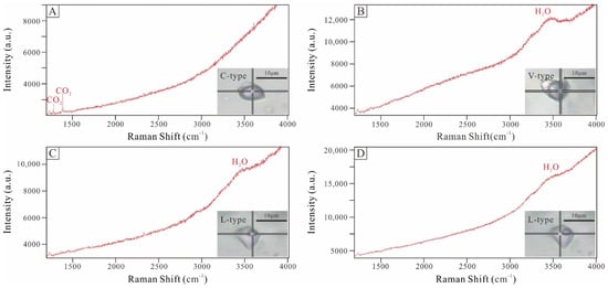 Representative laser Raman spectra for different types of FIs from the Huoluotai Cu (Mo) deposit. (A) The vapor phases of C-type FIs in stage I are rich in CO2; (B) The vapor phases of V-type FIs are almost entirely H2O; (C) The vapor phases of L-type FIs are almost entirely H2O; (D) The liquid phases of L-type FIs are almost entirely H2O.