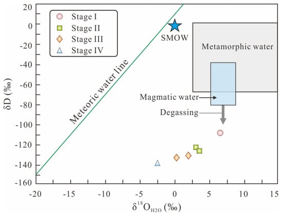 Plot of δD vs. δ18OH2O for the ore-forming fluids in the Huoluotai Cu (Mo) deposit [33]. SMOW = Standard Mean Ocean Water.