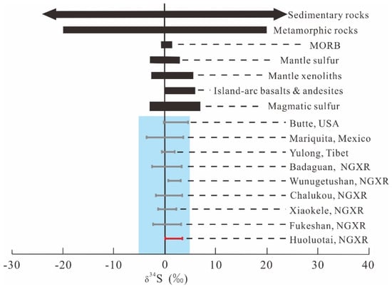 S isotope compositions of sulfides from the Huoluotai Cu (Mo) deposit, important S reservoirs [38,39,40], and other typical porphyry deposits elsewhere in the world [4,5,41,42,43,44,45,46].