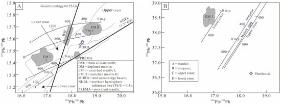 Pb isotope compositions of sulfides from the Huoluotai Cu (Mo) deposit [47]. (A) 207Pb/204Pb vs. 206Pb/204Pb. (B) 208Pb/204Pb vs. 206Pb/204Pb.