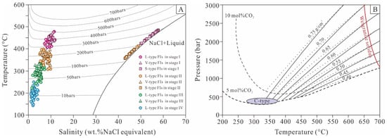 Trapping pressure can be estimated only when the actual trapping temperature is known or if fluid boiling occurred in the hydrothermal system at the time of entrapment [48,49]. During heating, L-type FIs homogenized into the aqueous liquid phase, while the V-type FIs homogenized into the vapor phase. In the Huoluotai Cu (Mo) deposit, the coexistence of L-, V-, and S-type FI assemblages (Figure 5A–F) within the same quartz crystal in stages I and II suggests that fluid boiling occurred in those stages. The trapping pressures in stage I were estimated to range from ~300 to ~500 bar (Figure 12A), assuming a simple NaCl–H2O system using the isobar equations given in [50]. However, the addition of CO2 to an NaCl–H2O system could raise the solvus and increase the entrapment pressure (Figure 12B; [51,52,53,54]). Therefore, in this study, the estimated trapping pressures in stage I represent only the minimum values. The trapping pressures in stage II were estimated to be between ~100 and ~300 bar and were mostly concentrated around ~200 bar (Figure 12A) based on the isobar equations given in [50]. There are clear decreasing trends of pressure from stages I to II (Figure 12A). Fluid boiling did not occur in stages III and IV, so the estimated trapping pressures represent only the minimum values [54]. The minimum trapping pressures in stages III and IV were estimated to range from ~30 to ~150 bar and <50 bar, respectively (Figure 12A).