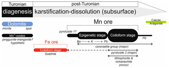 Simplified and modified paragenetic sequence. The position of the Fe mineralization prior to the Mn oxide is illustrated. Adapted from [12].