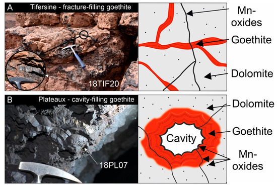 Style of the Fe mineralization and schematic representations. (A) Botryoidal goethite filling fractures and forming thin veins at Tifersine site (sample 18TIF20). (B) Large botryoidal goethite filling cavities at the Plateaux site (sample 18PL07).