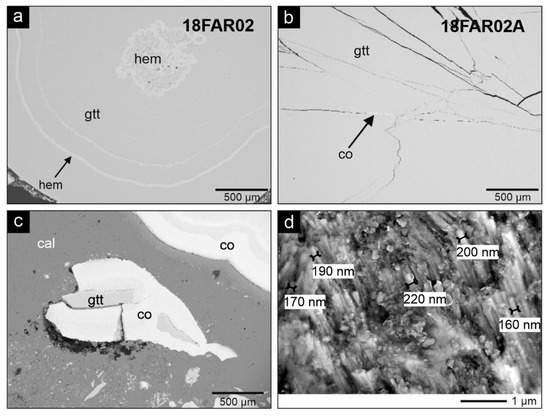 Botryoidal goethite in karst cavities and veinlets collected from the western part of the Imini district in Far West, Tifersine and Plateaux areas (Figure 3) show accretionary growth bands that indicate direct precipitation of successive generations of goethite (Figure 4). Goethite never replaces the dolostone fabric (Figure 5a,b) but is coated and intersected by later Mn oxides belonging to the coronadite group (Figure 5c). Botryoidal goethite consists of cohesive small crystals with homogeneous sections (Figure 5). The high level of homogeneity of the successive layers/generations of Imini botryoidal goethite is highlighted by SEM observations (Figure 5).