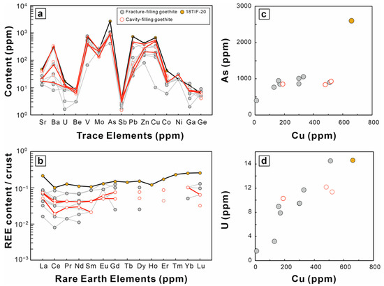 Geochemical data of Far West, Tifersine and Plateaux samples. (a) Trace element patterns; (b) rare earth element patterns normalized to the continental crust; (c) As vs. Cu contents and (d) U vs. Cu contents. The fracture-filling goethite is reported using gray circle symbols, except for 18TIF-20 where yellow-gray color is used, and the cavity-filling goethite is reported with a red open circle symbol.