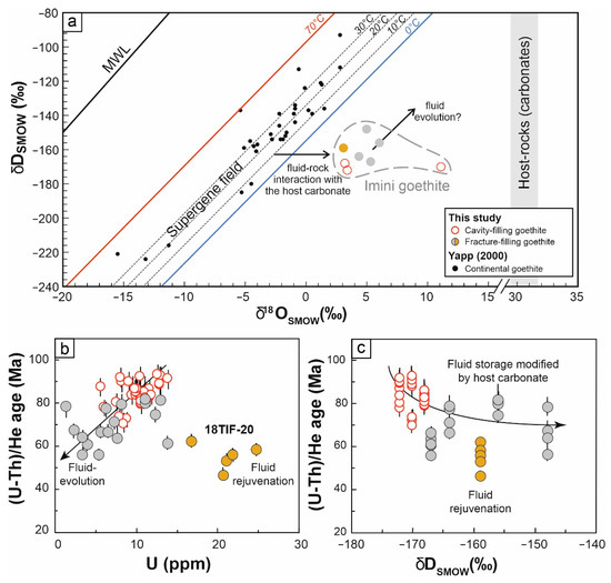 δD, δ18O and (U-Th)/He data of Imini goethite. (a) Evolution of the δD and δ18O values of the studied goethite. Continental goethite from [31] is reported for comparison as part of the supergene field. Temperature lines are calculated from [32]. The meteoric water line (MWL) of [33] is given for reference. Carbonate ranges of values of Cenomanian-Turonian dolostones are given by the gray shade [34]. (b,c) Imini goethite GHe age variation as a function of the effective uranium U content and the δD values, respectively. Cavity- and fracture-filling goethite (open red circle and orange circle, respectively) is reported. Sample 18TIF-20 fracture-filling goethite is distinguished from the other samples with a star filling the orange circle.
