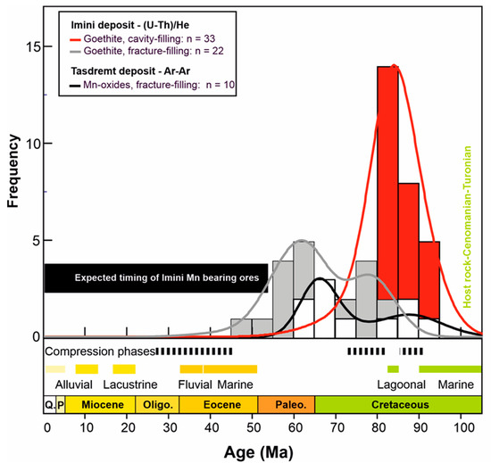 Imini cavity and fracture-filling goethite (U-Th)/He (this study) and Tasdremt coronadite group minerals 40Ar/39Ar [14]: histogram of age distribution. The late Cretaceous and middle to early Cenozoic compressional phases [15,37] and temporal information of sedimentological deposits [16,23] are also reported.