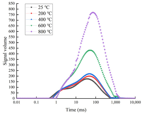 NMR was used to detect the relaxation response of protons in rock samples by performing Carr–Purcell–Meiboom–Gil pulse sequence tests on fully saturated rock specimens to obtain the transverse relaxation time T [40]. T is mainly influenced by the ratio of the surface area to the volume of the pores, which is proportional to the pore radius. Therefore, the pore size distribution of rock can be characterized by the NMR signal intensity of the T curve (amplitude, peak area, and continuity) [41]. Figure 4 shows the T profiles of the specimens obtained after different temperature treatments. The distribution characteristics of the microcrack of the specimens can be analyzed according to the T spectrum amplitude. The T amplitudes show a double-peak feature. The left peak corresponds to the fine pores, and the right peak corresponds to the microcracks. The left peak is lower than the right peak.