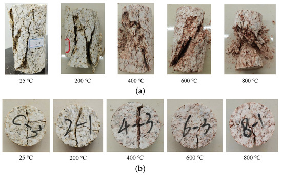 A KSL-1200X muffle furnace (maximum temperature of 1200 C, heating rate ≤ 10 C/min, temperature control accuracy ±1 C, HF-Kejing, Hefei, China) was used for the high-temperature treatment at 25 C, 200 C, 400 C, 600 C and 800 C for a total of five test groups. The experimental work of Chen [38] has indicated that 5 C/min is usually the threshold of the heating rate; above this threshold the damage mechanism of granite changes. To avoid thermal shock to the specimens, this study fixed a heating rate of 4 C/min. The preset temperature of the muffle furnace was maintained for 1h to allow the rock specimen to be fully heated. When the heating process was completed, the specimen naturally cooled to room temperature before being removed. As shown in Figure 2, with increasing temperature, the specimens gradually became more reddish brown and was more susceptible to damage with smaller forces, and the specimens of the 800 C test group made a sharp sound after a slight collision.