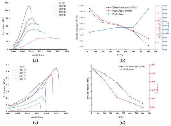 Effect of temperature on the mechanical properties of Beishan granite. (a) Uniaxial compression test: stress–strain curve; (b) Uniaxial compression test: mechanical properties; (c) Brazilian splitting test: stress–strain curve; (d) Brazilian splitting test: mechanical properties.