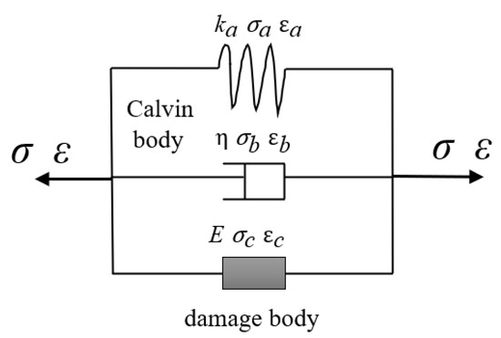 Many natural pores and tectonic fractures are distributed inside rock; they develop under loading and increasing temperature and eventually cause damage and failure. Among various mechanical components, the Calvin body can be used to characterize the viscoelastic properties of materials [44], and can be used to establish constitutive models for the mechanical response of materials such as rocks. However, since such models do not include damage properties to consider the influence of thermal damage of granite, this paper assumes that the mechanical model of granite consists of a Calvin body and a damaged body in parallel, as shown in Figure 9.