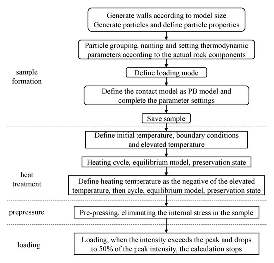 Particle flow code (PFC) is one of the most important tools for investigations of the mechanical properties of rocks [57]. PFC uses particles as the basic unit to study the complex deformation properties of materials. It treats the material as a collection of tiny spherical or disc particles, which are connected to each other by “adhesions”. The mechanical properties are determined by both the physical and mechanical properties of the particles and the contact. The advantage of PFC is that it can simulate the material transport and stress transfer inside the specimen, as well as the crack opening, extension, and elongation processes. It can monitor the location and number of microcracks generated during the damage of the specimen, the stress-strain state, the morphology of the crack when it penetrates, and the strength of the specimen. Therefore, it can simulate the mechanical properties of materials at the microscopic scale. In this study, PFC was applied to simulate the high-temperature damage of Beishan granite. The simulation process was divided into four steps: sample formation, heat treatment, prepressure, and loading. The flow chart of the modeling is shown in Figure 11.