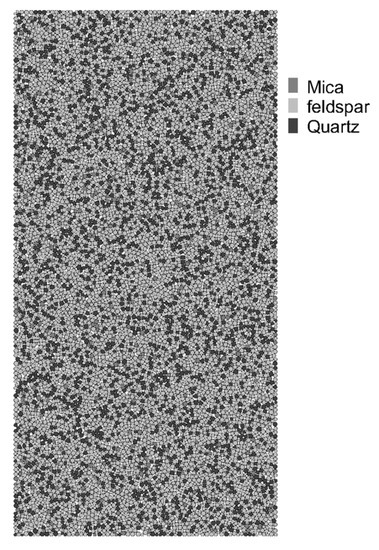 First, the model was generated using the FISH function of PFC. An outer wall with a height of 100 mm and width of 50 mm was built and filled with particles. The minimum particle size was 0.6 mm, and the ratio of the maximum particle size to the minimum particle size was 1.66. A total of 9017 particles were filled, and the initial establishment of the model was completed after equilibrating the system. Considering that the components of Beishan granite are 67.90% feldspar, 27.40% quartz, and 4.70% mica, 6123 particles were randomly selected and designated as the feldspar group. Similarly, 2471 particles were in the quartz group, and 423 particles were in the mica group. Figure 12 describes the generated particle flow model.