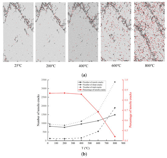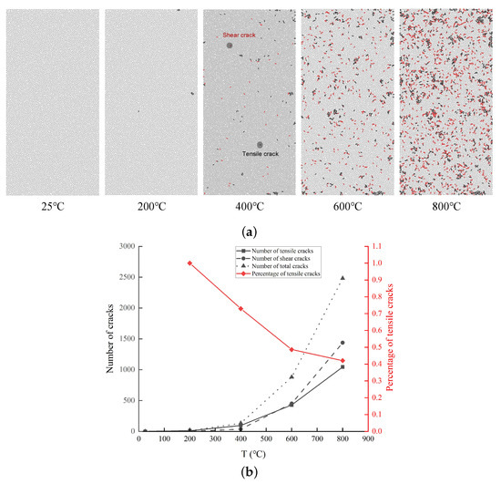 Figure 14b shows that 829 tensile cracks and 126 shear cracks form after reaching the damage strength at 25 C, the tensile cracks account for 86.81% of the total number of cracks, and the damage is mainly due to tensile damage. From the appearance of the sample, the distribution of cracks is concentrated, and is mainly located in the upper part of the model, and the cracks develop from the middle of the upper surface to the middle of the left and right sides. The shear zone gradually develops into a rupture surface. With increasing temperature, the number of tensile cracks gradually increases, while the number of shear cracks increases faster, and the latter exceeds the former at 800 C. The trend of the total number of cracks is similar to that of shear cracks, indicating that the specimen is significantly affected by shear damage. A total of 1489 tensile cracks and 1890 shear cracks form after reaching the damage strength at 800 C. The shear cracks account for 55.93% of the total number of cracks, which is 15× that at 25 C, indicating that the damage is changed from mainly tensile cracks to mainly shear cracks with increasing temperature. From the images it is observed that the cracks are more scattered at 800 C than at 25 C; they develop from the top of the upper surface to the middle of the right side while also expanding from the middle of the left side to the lower surface, forming two rupture surfaces. A higher temperature corresponds to a higher degree of damage.