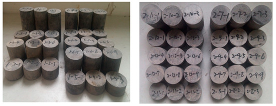 The rock cores taken from the Sima coal mine were processed, and the uniaxial compression deformation tests were conducted using specimens with a diameter of 50 mm and a height of 100 mm. For the tensile strength test, a specimen with a diameter of 50 mm and a height of 25 mm was used. A cylindrical specimen with a diameter of 50 mm and a height of 100 mm was used for the compression-shear test. An example of the specimen used in this experiment is shown in Figure 2.
