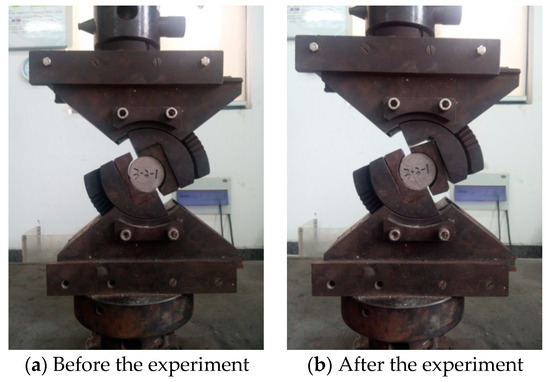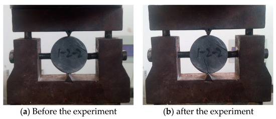 - Uniaxial tensile strength experiments of the specimens were carried out by the splitting method. The diameter and height of the specimens were also measured before the experiment, and after the measurement was completed, each specimen was placed on the tensile jig and loaded until the specimen was damaged. An example of the field experiment is shown in Figure 4.