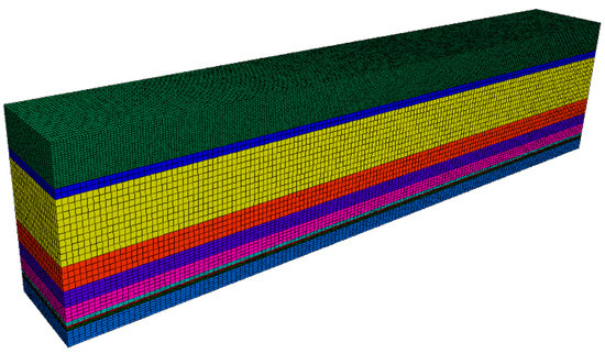 The Sima mine coal seam has a small dip angle and belongs to the near horizontal coal seam, so it is considered as a horizontal coal seam in the numerical simulation calculation. In order to analyze the movement and deformation law of the overlying rock seam and the ground surface more clearly, the model was built from the bottom 30 m of the coal seam to the ground surface. The model is divided into 399,000 units and 454,881 nodes, and the model is shown in Figure 6.