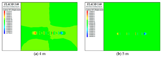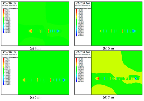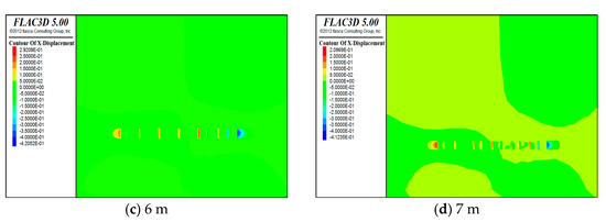 Horizontal displacement cloud for (a) 4 m, (b) 5 m, (c) 6 m, and (d) 7 m.